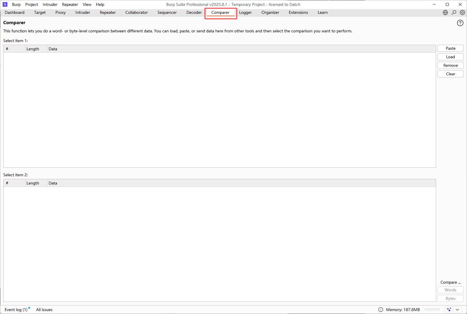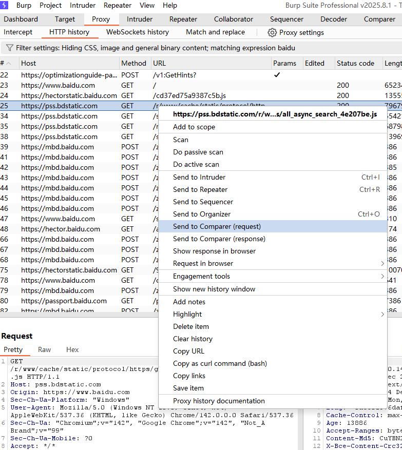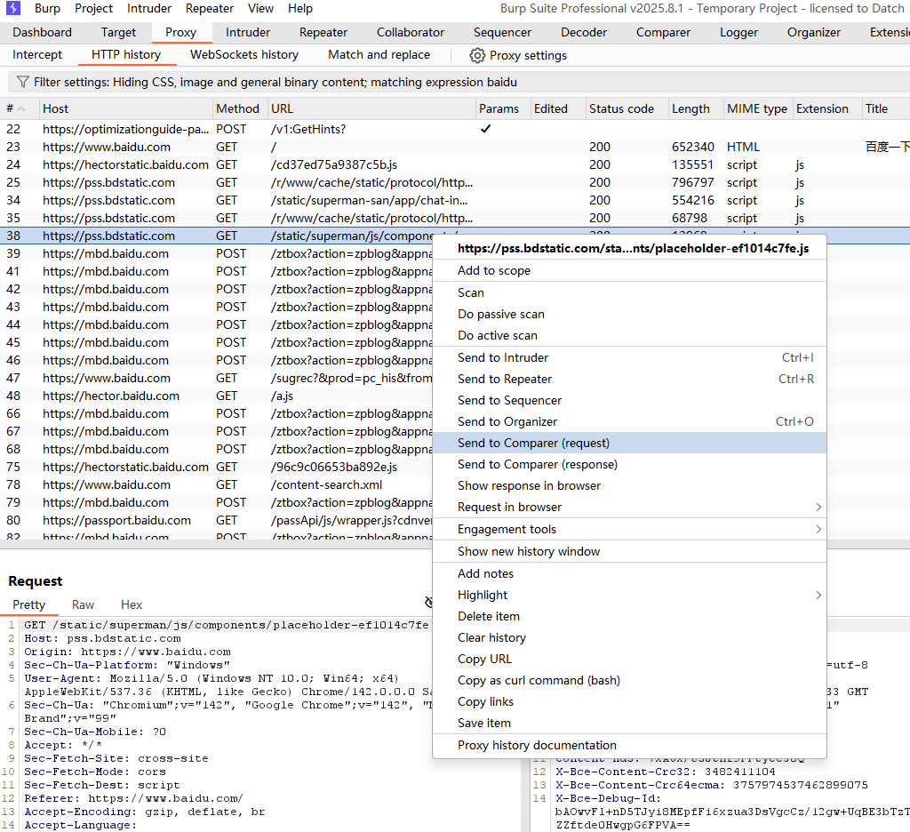 然后随便选择一个数据包,右击选择Send to Comparer(request),它就会把这个数据包的请求数据发送到对比器模块中