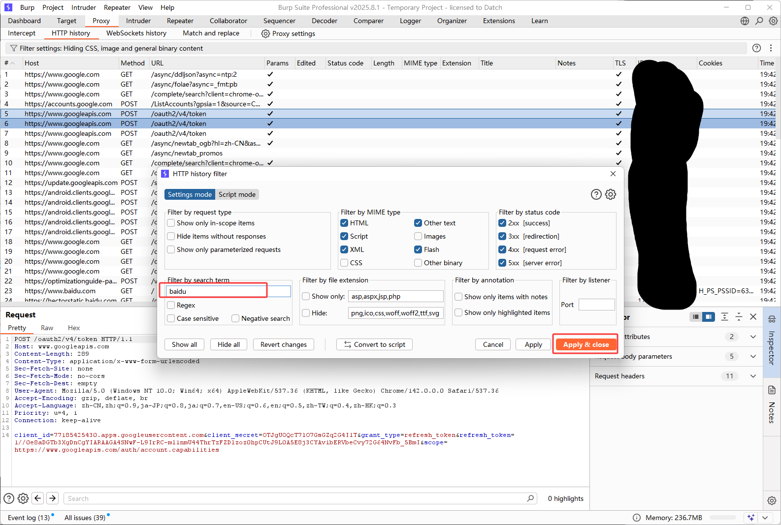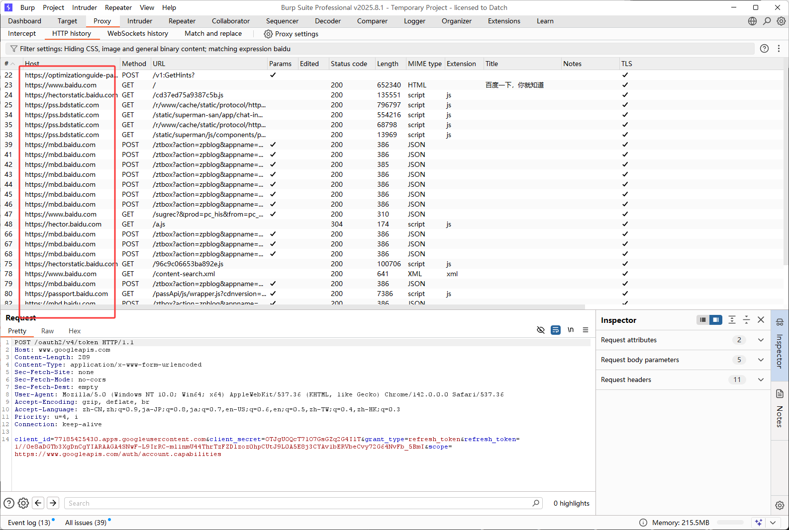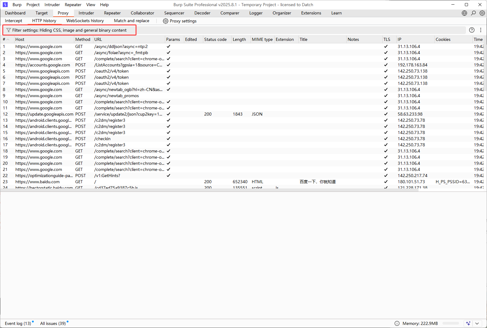 然后随便选择一个数据包,右击选择Send to Comparer(request),它就会把这个数据包的请求数据发送到对比器模块中