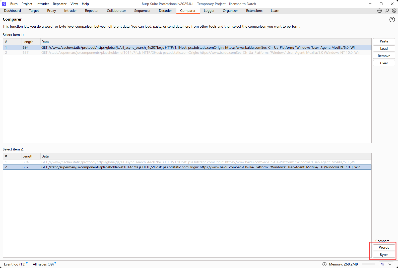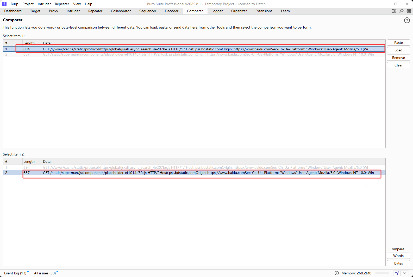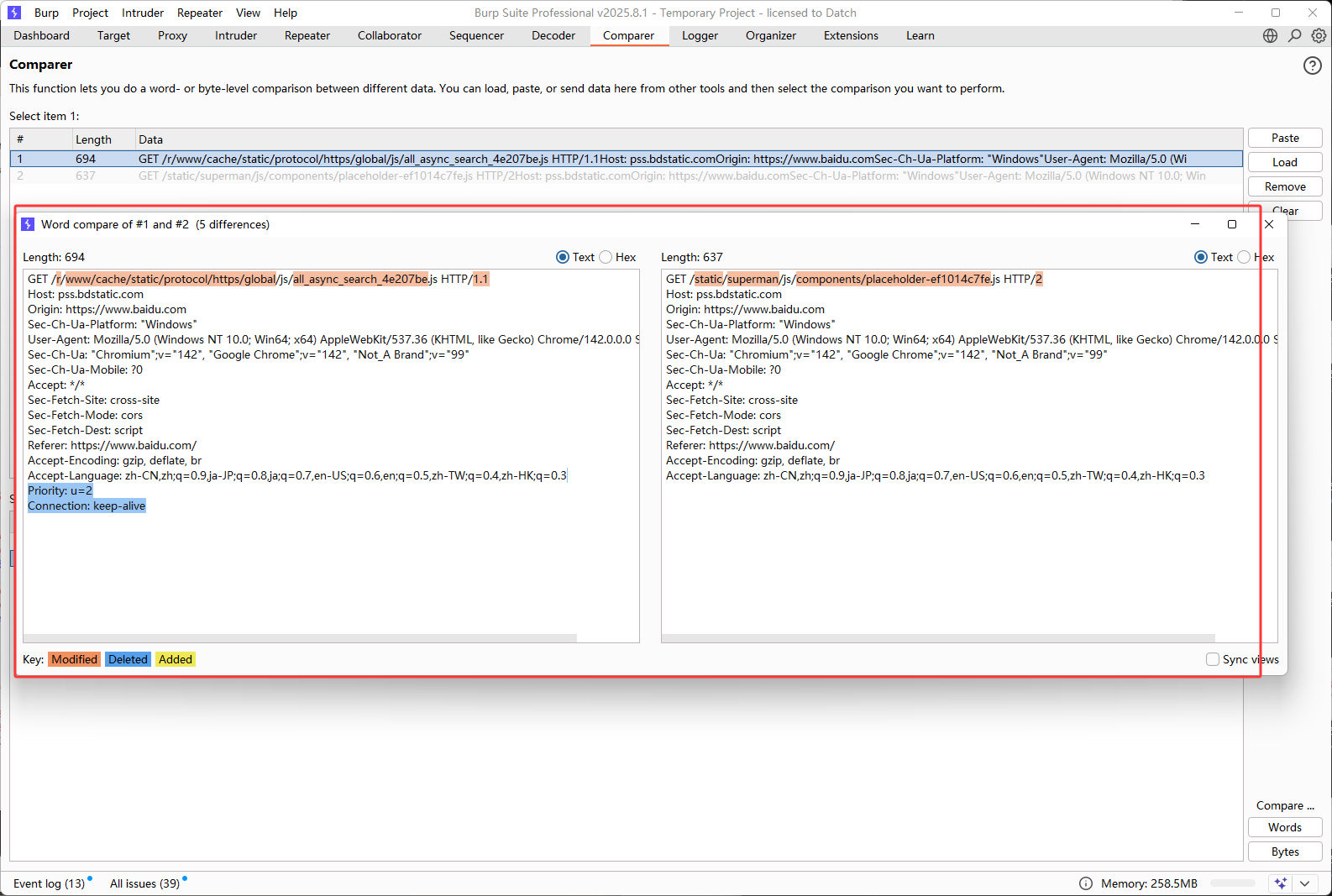 然后就可以看到对比的内容了,两个数据包不同的地方它会高亮显示,做细致测试的时候会用它