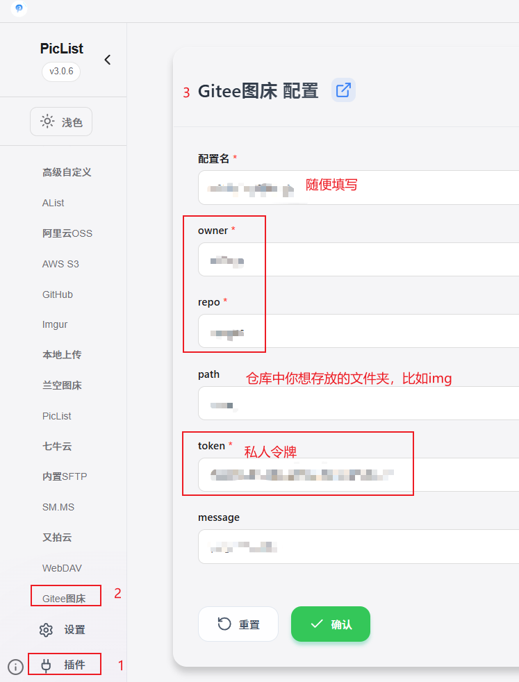 安装piclist,在piclist中搜索、安装gitee_upload插件,配置上一步中gitee图床相关信息