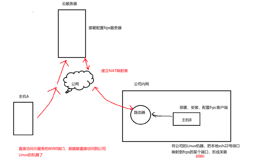 内网穿透本质是从一个内网访问到另一个内网的过程。想要进行内网穿透就必须要用到一个服务器,云服务也可以。在公式的主机电脑里部署fpc客户端,同时在云服务器上部署fpc服务端。Fpc绑定自己主机的ssh端口与fpc端口并与fps服务器建立连接。