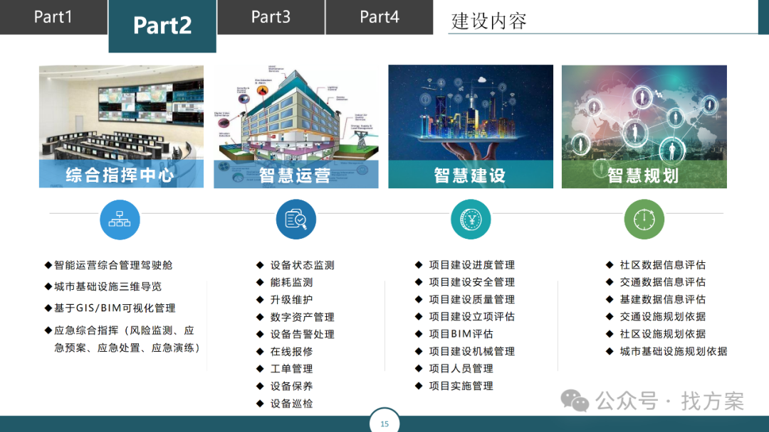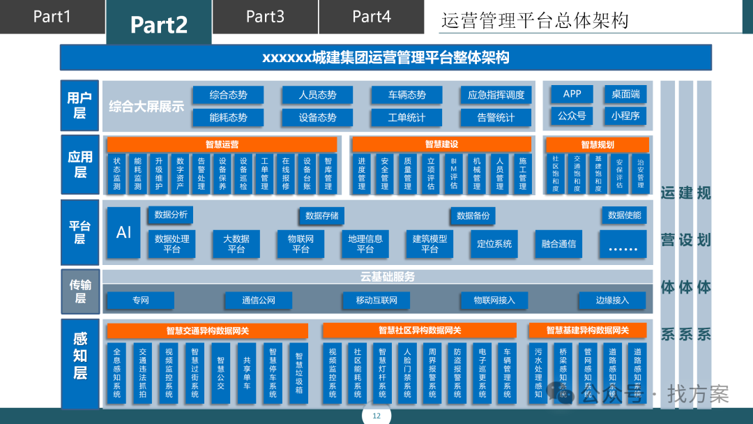 应用层:涵盖智慧运营、智慧建设、智慧规划三大核心板块,细分设备管理、能耗监测、进度管理、交通规划等多个功能模块;