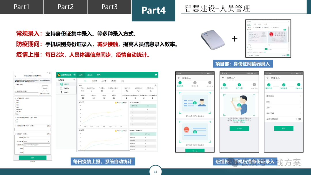 人员管理:支持身份证录入、人脸考勤,疫情期间可实现无接触录入和体温上报,自动统计人员健康状况,保障施工安全。