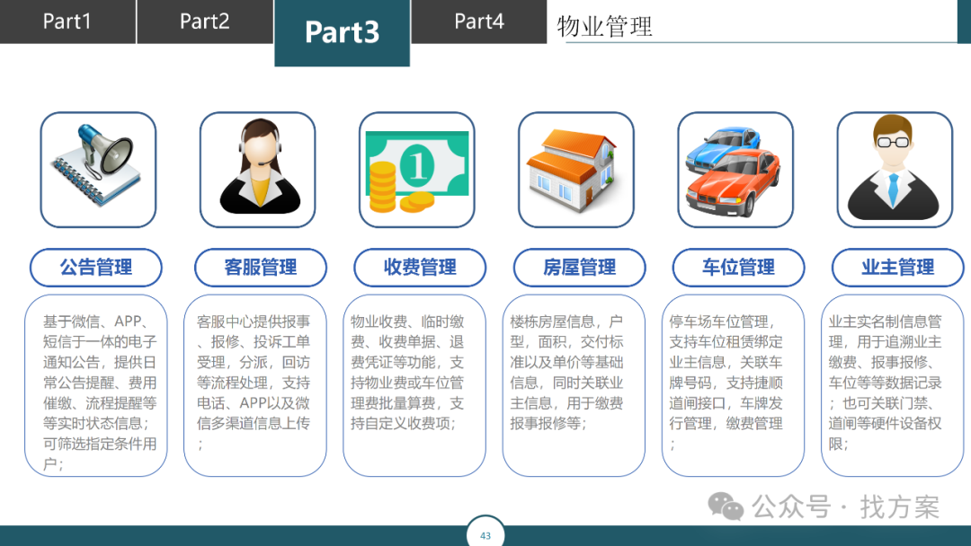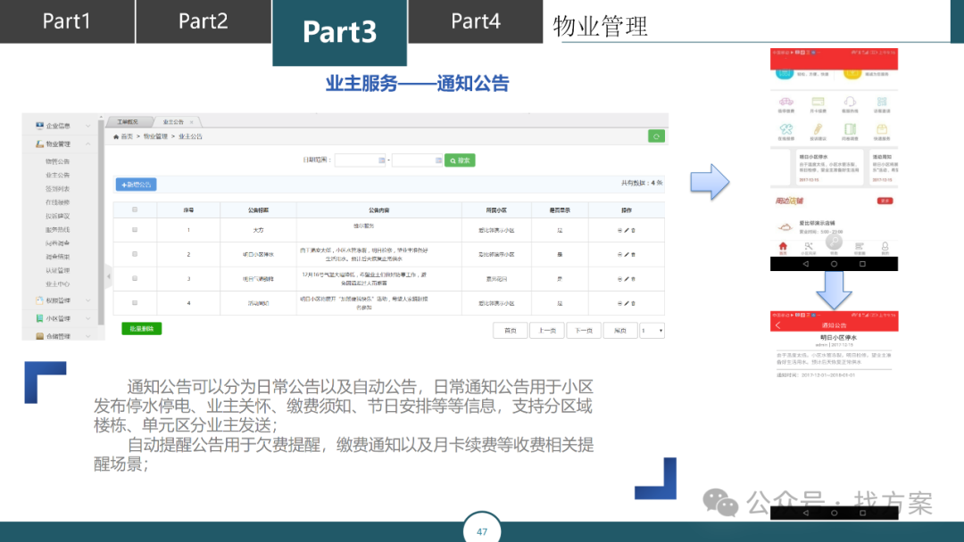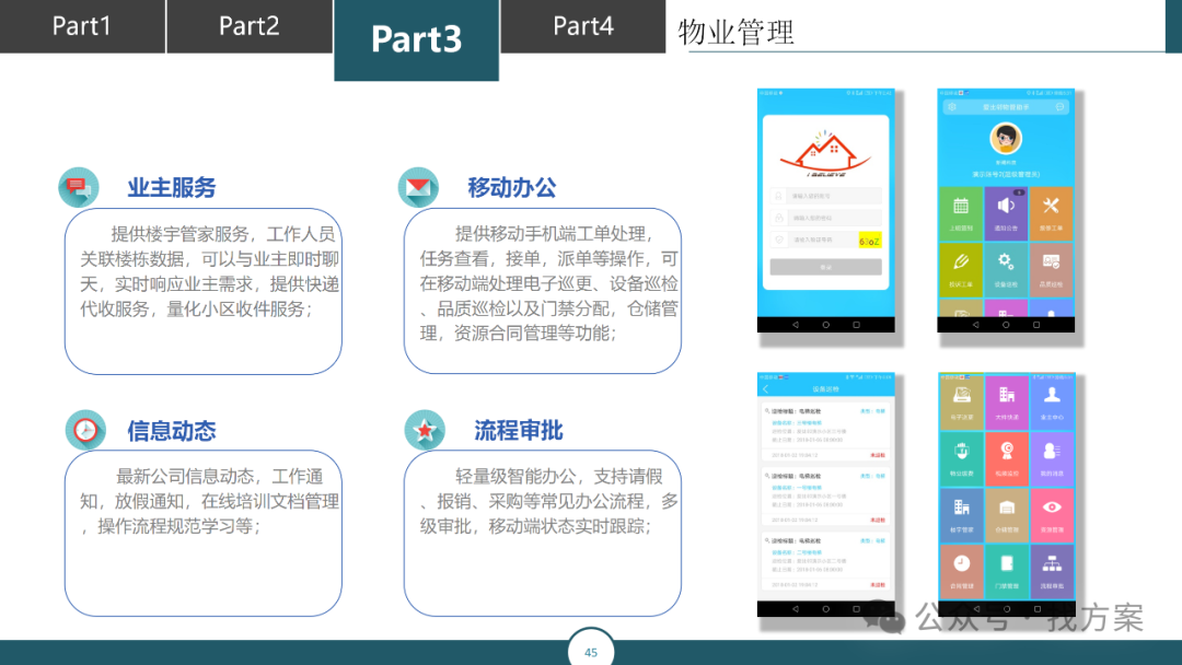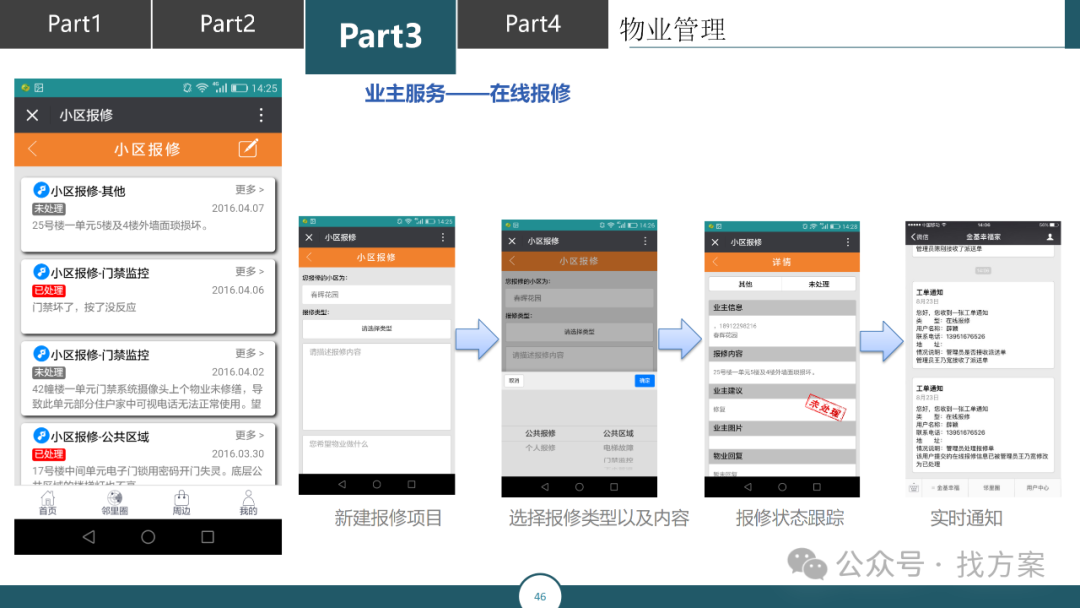 业主服务:通过 APP、微信等渠道,提供在线报修、通知公告、物业缴费、访客管理等服务,业主可实时跟踪报修进度,物业可快速响应需求;
