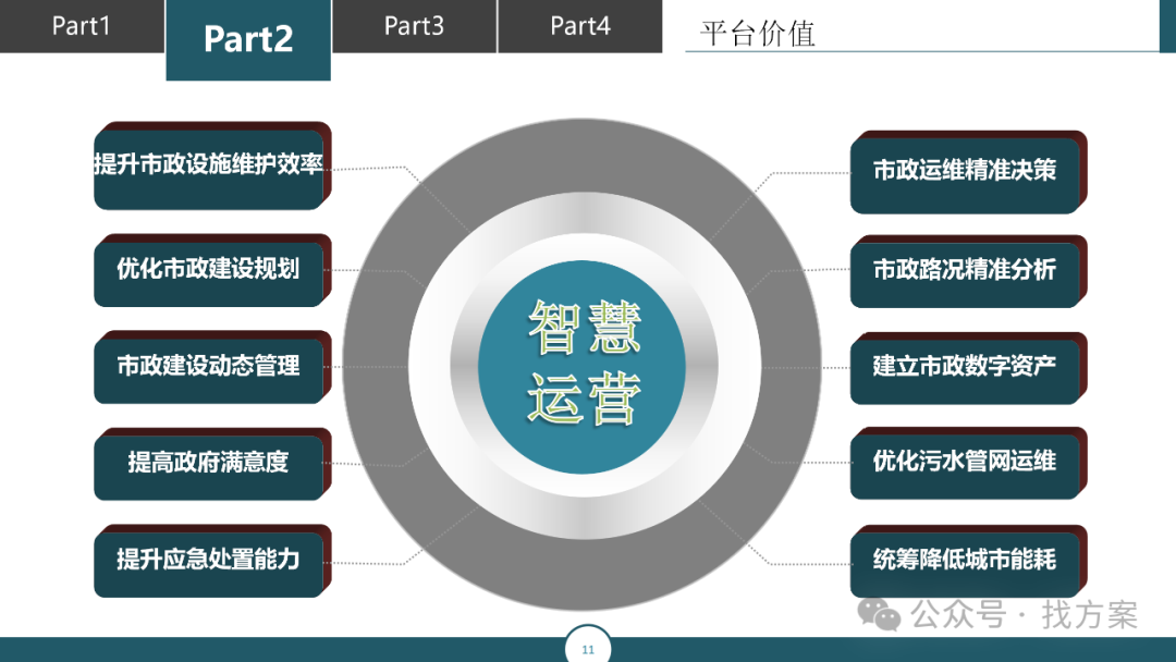 平台的核心目标是赋予城市自我感知、自我认知、自我预知、自我决策的能力。通过对城市基础设施全生命周期管理,实现城市运营从粗放式向数字化、精细化转型,为城市建设和规划提供科学的数据支撑,最终达成提升市政设施维护效率、优化建设规划、精准分析路况、建立数字资产、提升应急处置能力等多重价值。