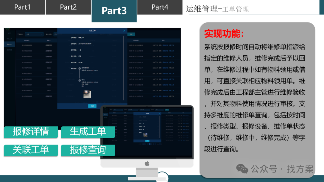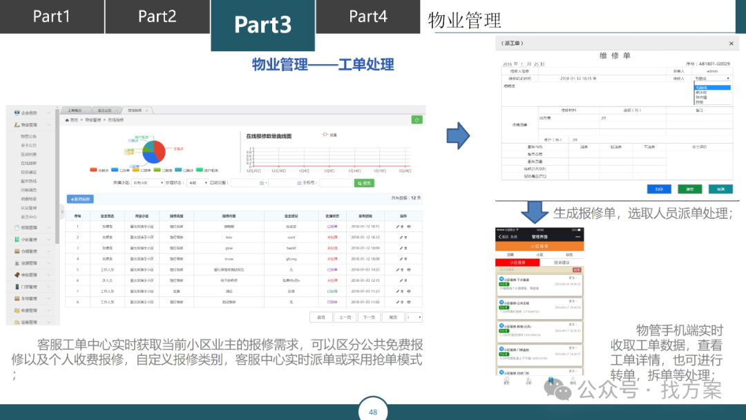 工单处理:支持多渠道报修接入,自动生成工单并派发给维修人员,维修过程可跟踪、可评价,形成服务闭环。