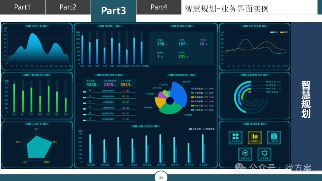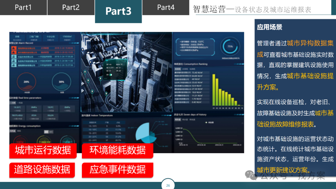 综合大屏展示:整合人员、设备、能耗、车辆、工单等多维数据,通过图表、地图等形式直观呈现,管理者可实时掌握城市运行态势;