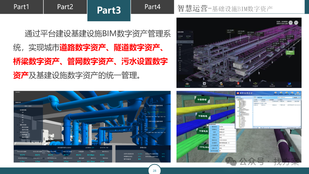 数字资产建模:建立道路、桥梁、管网、污水处理等基础设施的 BIM 数字资产库,详细记录设备参数、运行状态、维护历史等信息,实现全生命周期管理。