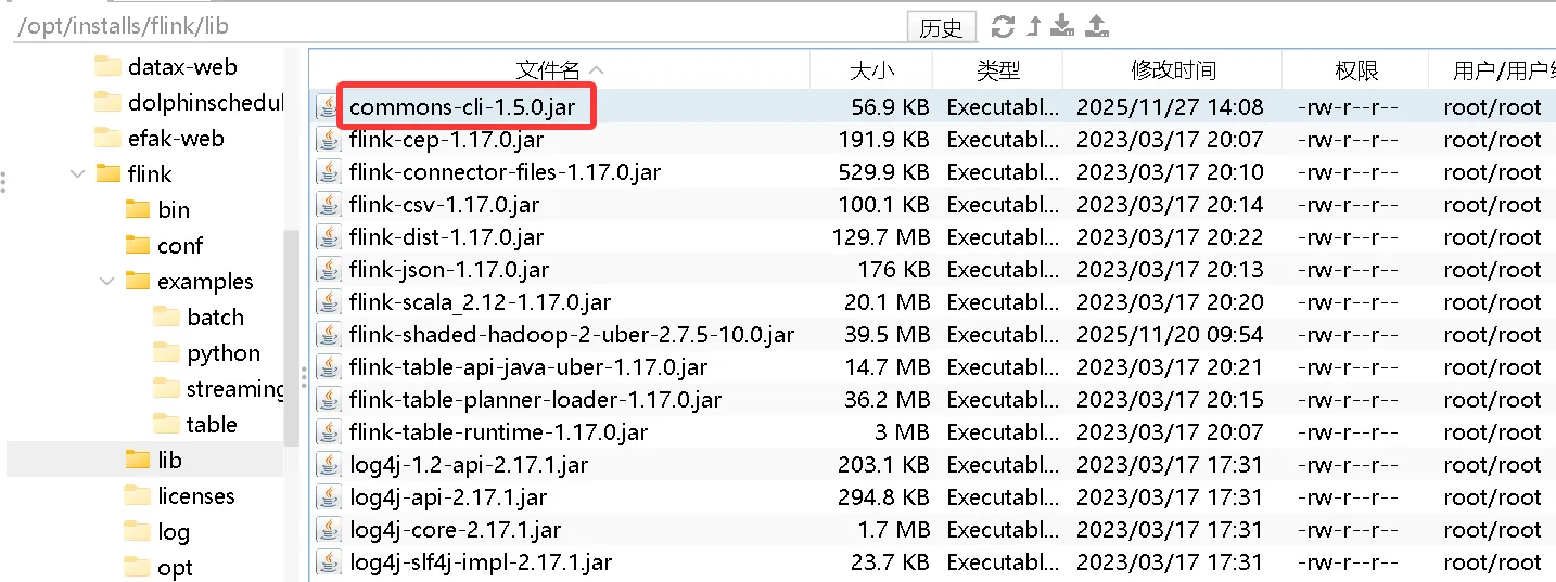 root@bigdata01 app\]# flink run -c com.bigdata.day05.Demo02 -s hdfs://bigdata01:9820/flink/checkpoint/e6042dae1a29a23c0ffdb0dcc8820b0e/chk-259 FlinkDemo-1.0-SNAPSHOT.jar java.lang.NoSuchMethodError: org.apache.commons.cli.CommandLine.hasOption(Lorg/apache/commons/cli/Option;)Z 后面只要出现一个z,版本冲突 windows 上的commons-cli 和 flink集群中的 commons-cli 版本冲突了。 修改方案:将本地的 windows 上的 common-cli 拷贝到服务器上 将本地仓库的这个包:  上传至:  记得分发一下: xsync.sh /opt/installs/flink/lib/commons-cli-1.5.0.jar flink 集群不需要重启,直接就起作用了。