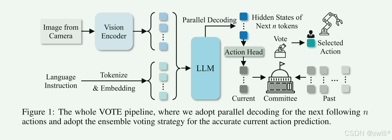 VOTE (新方法) :只需要模型运行 1 次 (生成 <ACT>)。那个 MLP 动作头虽然有几层,但在 GPU 上运算是瞬间完成的(并行计算)。