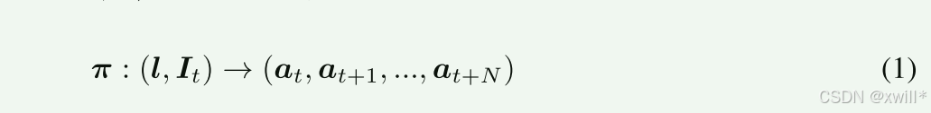 基于图像 I∈RW×H×3 和语言指令 l 生成动作。使用模型π 来预测一个时间动作序列。at可以描述具有不同控制模式和末端执行器的各种机器人动作。