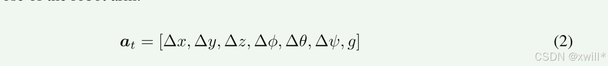 Δx,Δy,Δz 是末端执行器的相对平移偏移量,Δϕ,Δθ,Δψ表示旋转变化,g∈{0,1} 指示夹爪的开/合状态。这种动作空间实现了对机械臂运动和末端执行器行为的连续控制。
