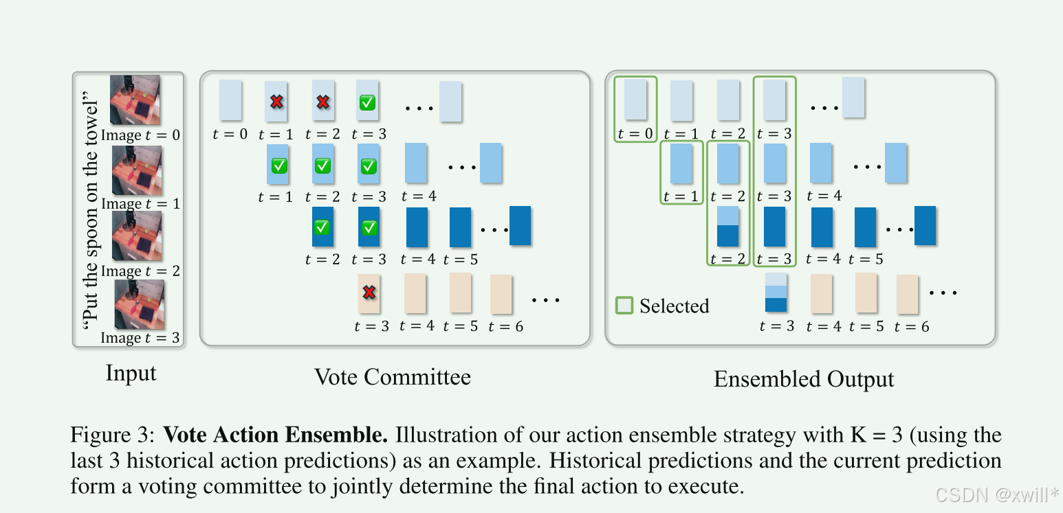 VLA 模型如果只依赖最近的输入(most recent multimodal inputs),容易出错。VOTE构建一个机制,把之前步骤预测的动作(actions predicted in previous steps)也纳入考虑,根据之前的预测积累"票数"进行加权,来决定当前的动作。从而实现了隐式纠错(Implicit error correction),降低了预测错误的可能性,提高了测试时的性能。