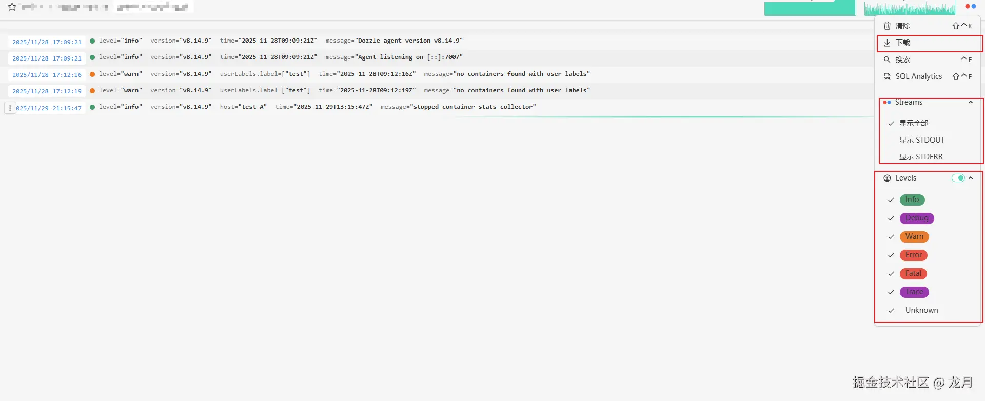 如需查看容器日志,只需要点击对应容器即可,dozzle提供了多种功能如下载、日志分级、搜索等功能