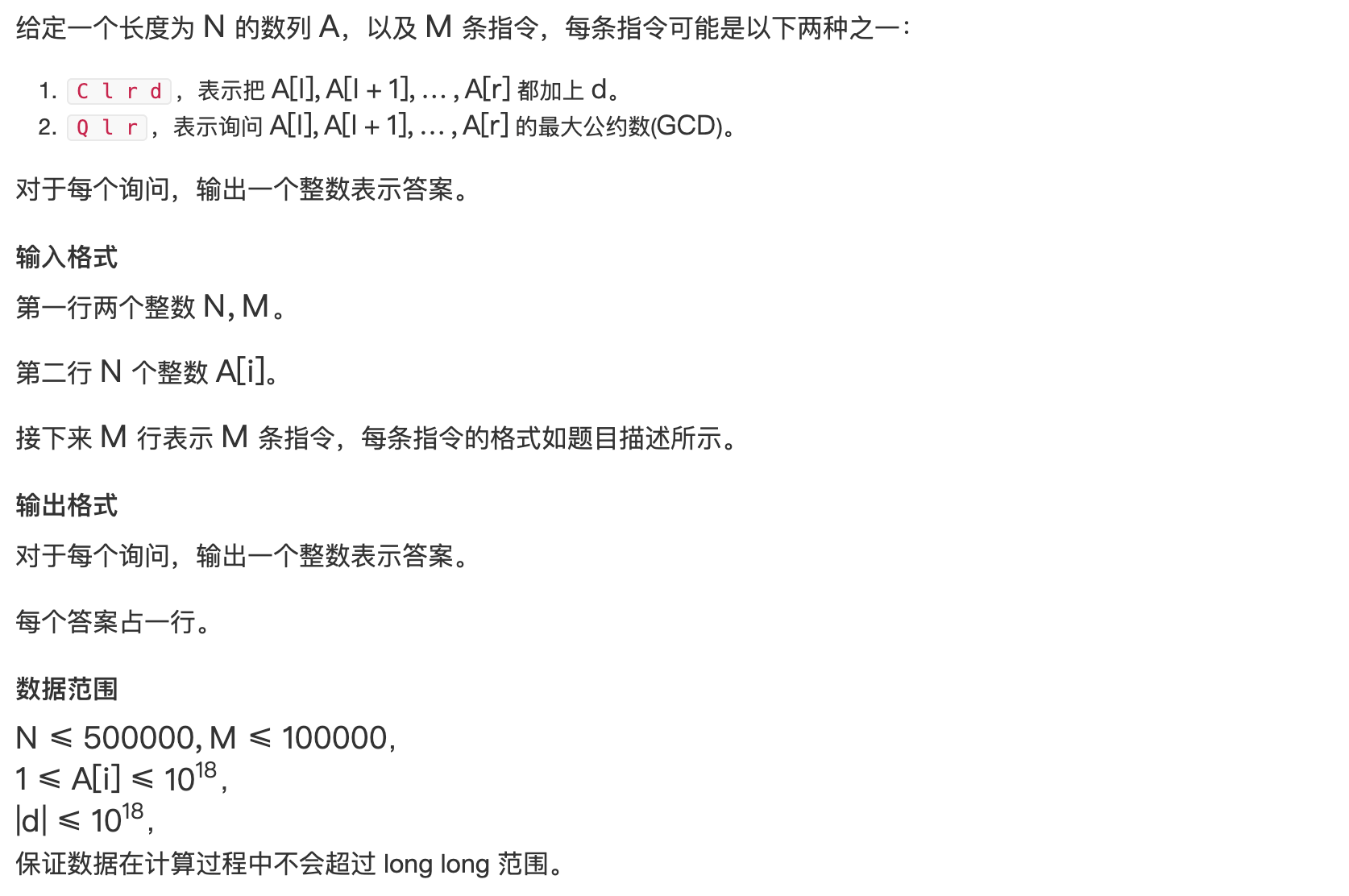 对于 gcd ( b l + 1 ∼ b r ) \gcd(b_{l + 1} \sim b_r) gcd(bl+1∼br), 区间查询 g c d gcd gcd, 单点修改值(因为改的是差分数组)