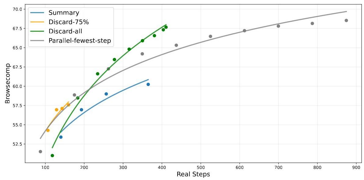 结果显示,简单的Discard-all策略将BrowseComp性能从53.4%提升至67.6%,与并行扩展效果相当但步数更少。