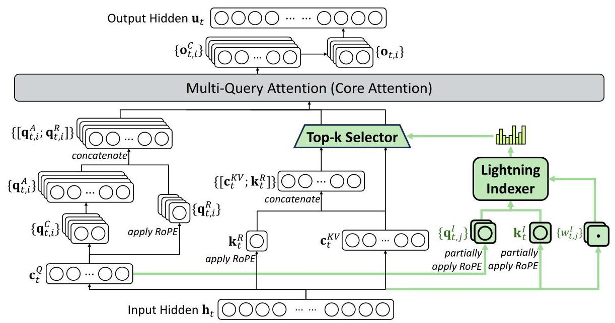 其中HIH^IHI是索引头的数量,ReLU激活函数的选择是为了提升吞吐量。索引器使用FP8精度,计算效率极高。