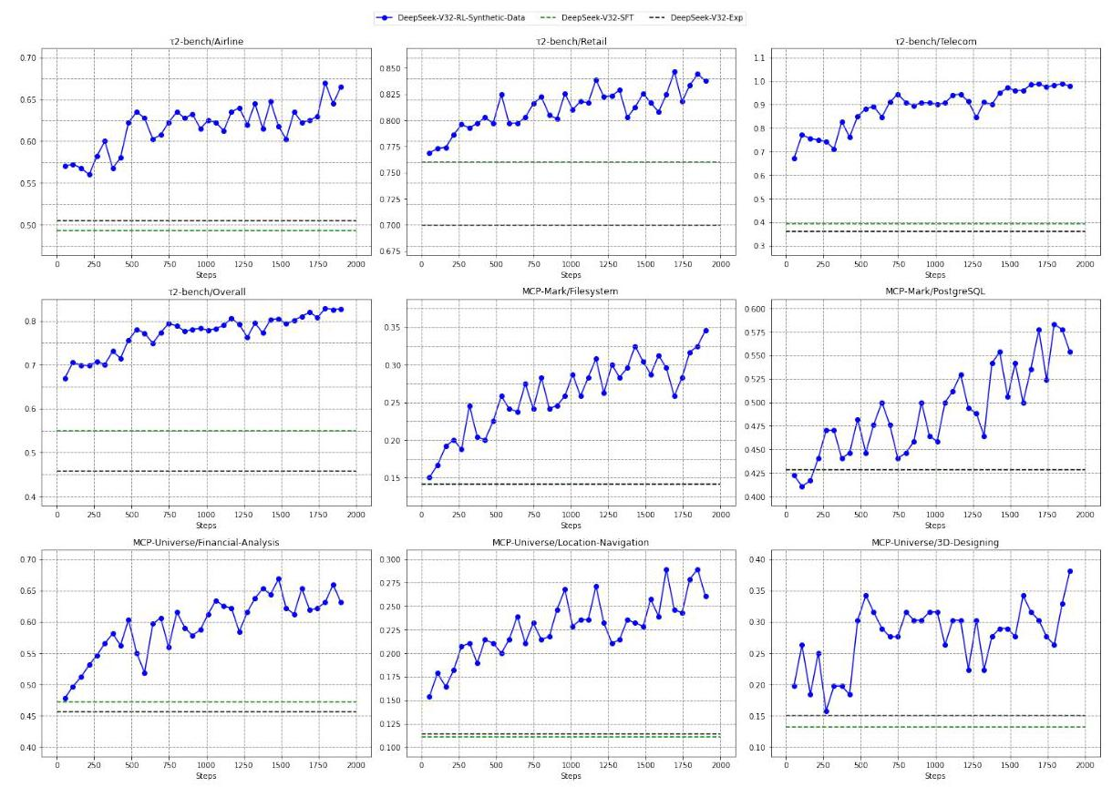 泛化能力验证:仅在合成任务上进行RL训练,在真实基准上取得显著提升: