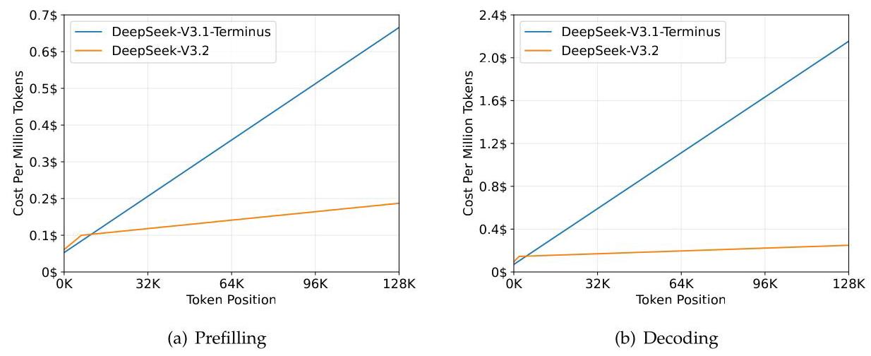 DSA显著降低长文本推理成本。在H800集群上(租赁价格2美元/GPU小时),随着token位置增加,DeepSeek-V3.2的成本增长远低于V3.1-Terminus。