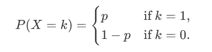 或简写:P(X=k)=pk(1−p)1−k,k∈{0,1}P(X=k) = p^k(1-p)^{1-k}, k\in\{0,1\}P(X=k)=pk(1−p)1−k,k∈{0,1}