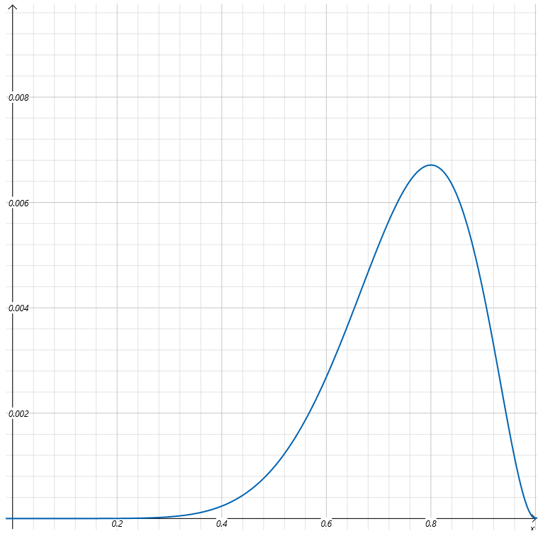 假设已知一个事情发生了(抽到8次黑球,2次白球),求概率分布(箱子里黑球和白球的分布)。我们假设抽到黑球的概率为a,则抽到白球的概率为(1-a)。则抽到8次黑球,2次白球的似然函数为:L(a)=a8(1−a)2L(a)=a^8 (1−a) ^2L(a)=a8(1−a)2,注意这里抽到黑球的概率a为变量。a作为自变量,抽到8次黑球,2次白球事件的概率作为因变量。上式中的函数L(a)就是似然函数,我们可以绘制出这个函数的曲线: