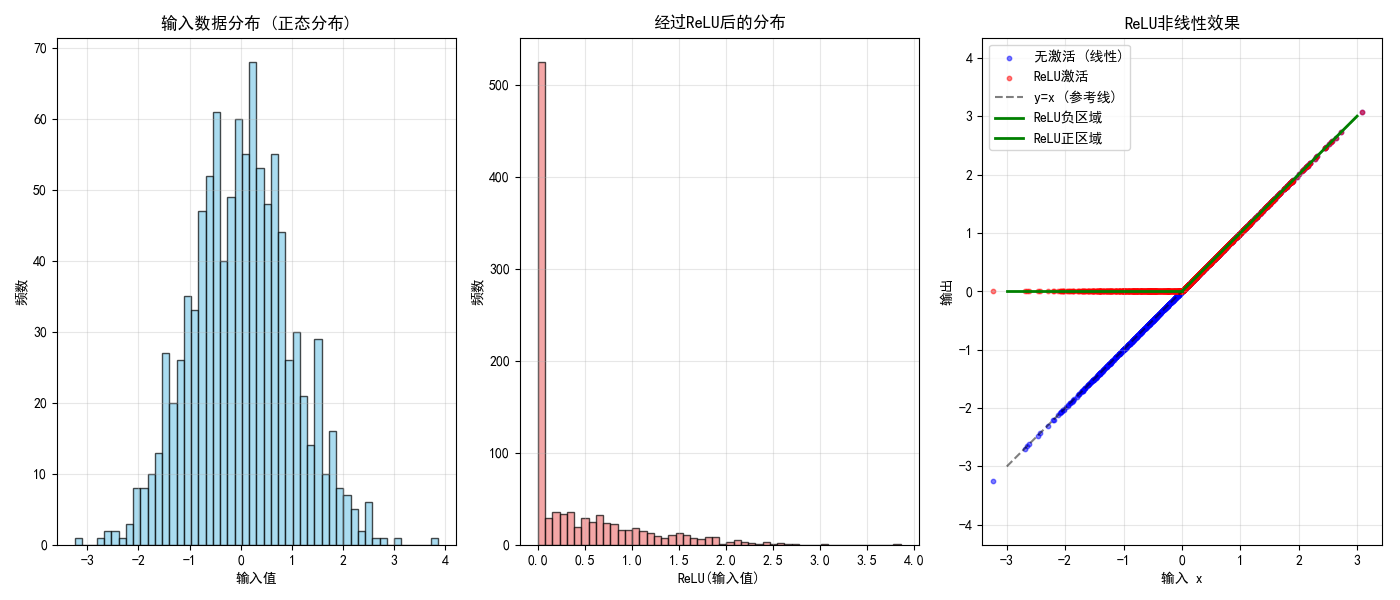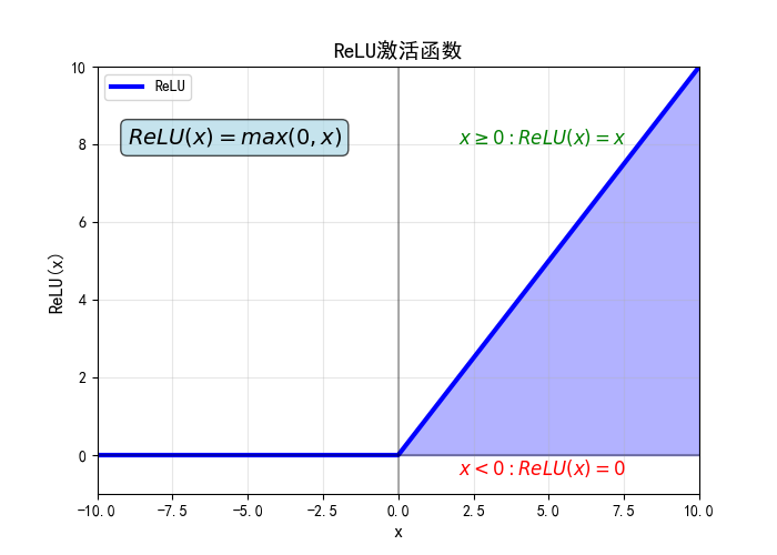 ReLU 通常用于神经网络的隐藏层,但也可以在某些情况下作为激活函数。ReLU 的输出为输入值本身(对于正数)或者 0(对于负数),即: