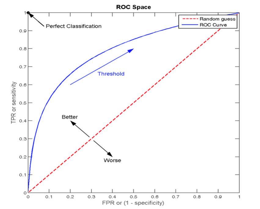 ROC曲线以模型的真正率TPR为纵轴,假正率FPR为横轴,它将模型在不同阈值下的表现以曲线的形式展现出来。曲线越靠近 (0,1) 点则模型对正负样本的辨别能力就越强。ROC曲线的优劣可以通过曲线下的面积(AUC)来衡量,AUC越大表示分类器性能越好。