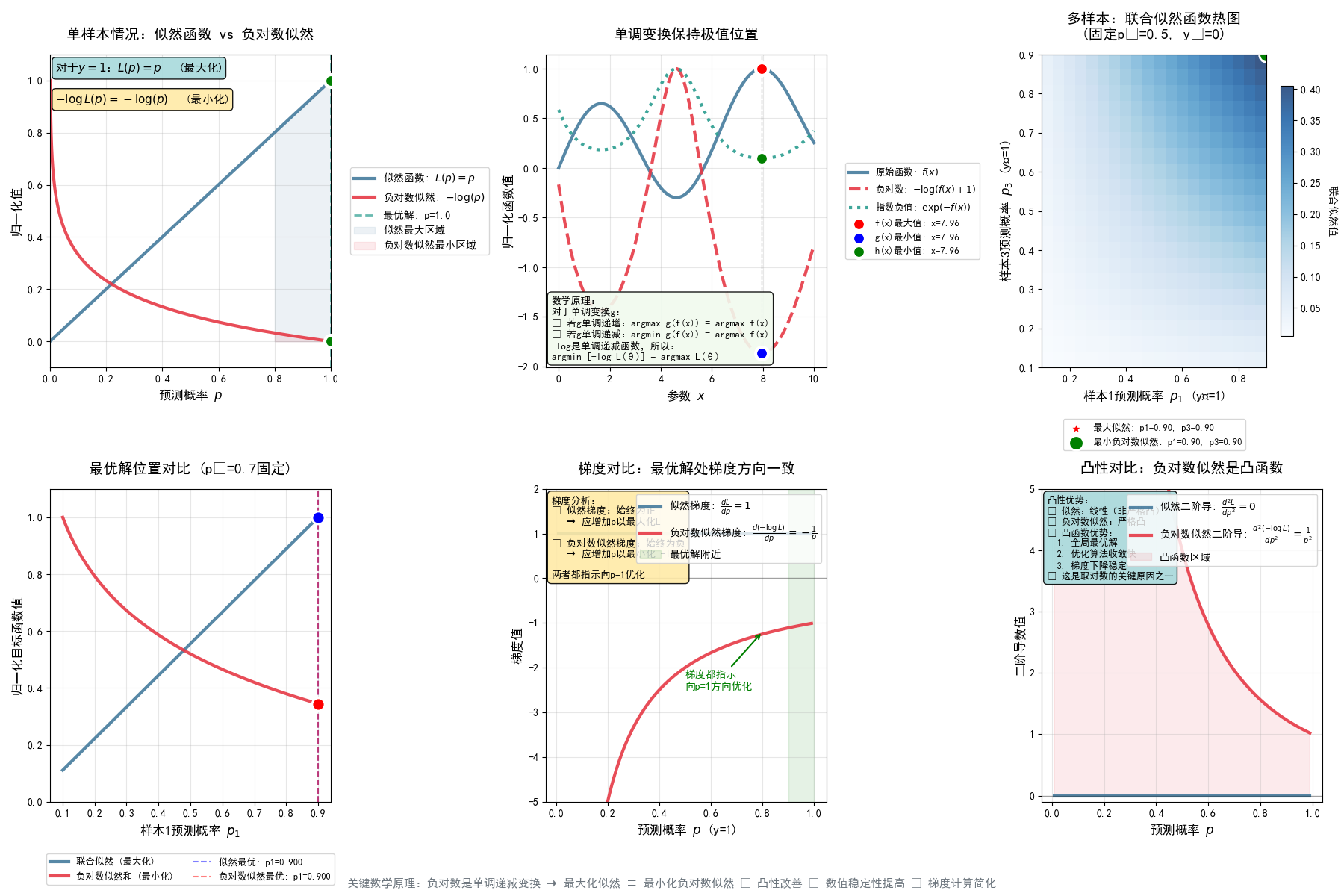 所以,可以理解为伯努利分布的似然函数是逻辑回归交叉熵损失的来源。我们要最大化时间概率(进行极大似然估计),就等价于最小化交叉熵损失。这里为什么要取负对数,其实是为了方便计算,将累乘变成累加,并且实际的极值点位置是不变的。