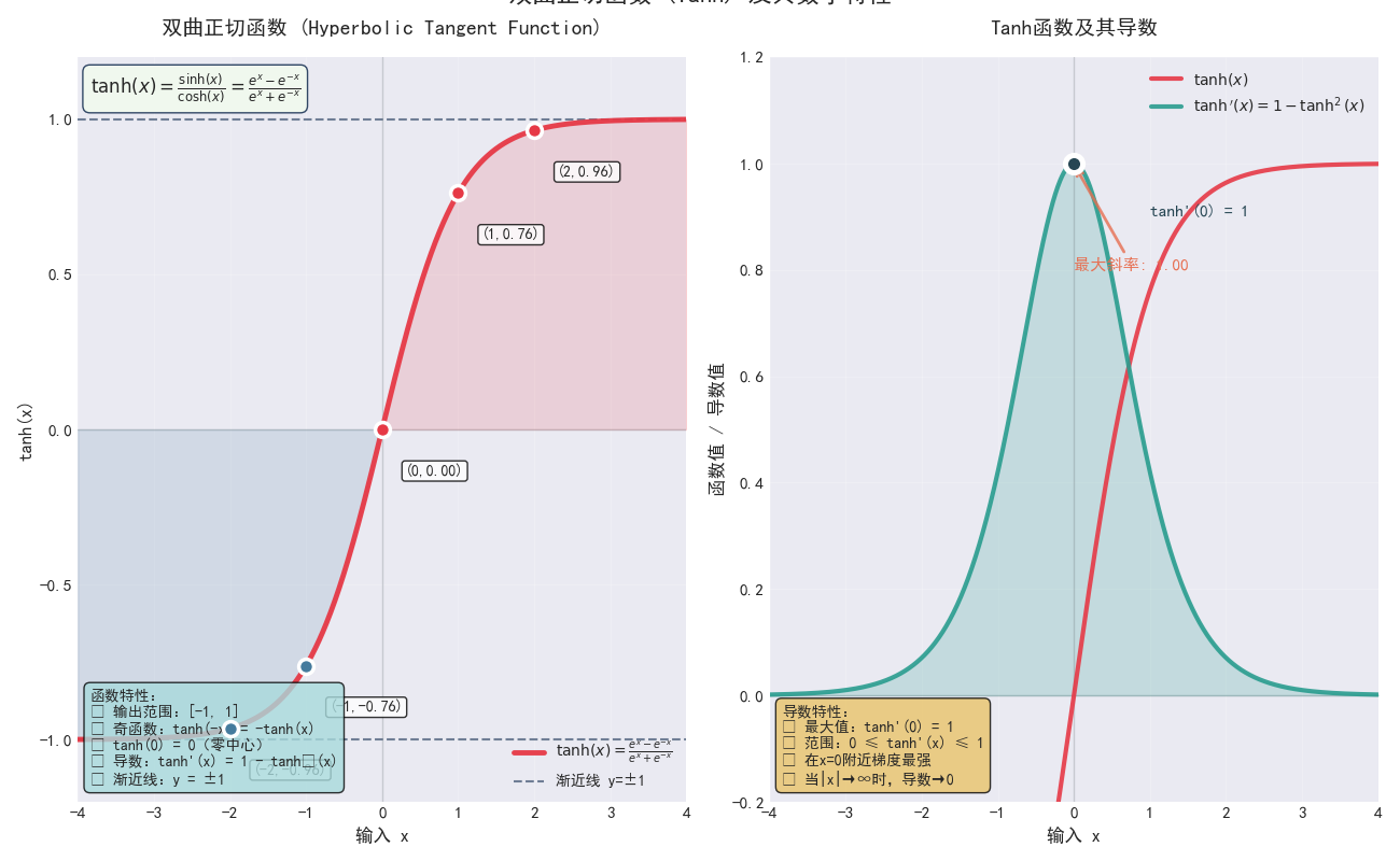 Tanh 函数是 Sigmoid 的一种变体,其输出范围是 [-1, 1],而 Sigmoid 的输出范围是 [0, 1],Tanh 函数将输入值压缩到更大的范围,对于输入较大的正负值,输出的梯度较小。