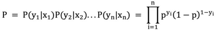 假设:有样本[(𝑥1,𝑦1),(𝑥1,𝑦2)...,(𝑥𝑛,𝑦𝑛)][(𝑥_1, 𝑦_1), (𝑥_1, 𝑦_2) ..., (𝑥_𝑛, 𝑦_𝑛) ][(x1,y1),(x1,y2)...,(xn,yn)],n个样本都预测正确的概率就是伯努利分布的似然函数: