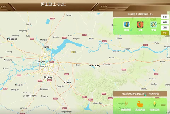 实时呈现当前黑土地上水稻、玉米、大豆等主要农作物的种植分布及面积占比,以及市场接受度最高的作物种类,如优质粳稻、高油大豆、饲用玉米等,为种植户提供市场导向和种植参考,可以了解黑土地的种植和市场情况。