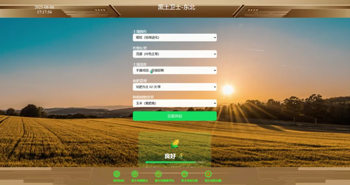 基于土壤颜色、作物长势、湿度等五大指标,项目开发动态评估模型。用户输入参数后,系统实时生成健康报告,如当土壤呈黑褐色、作物叶色正常时,评估结果显示"整体健康,注意轮作与有机肥补充"。评估界面融合金色田野背景,通过可视化数据帮助农户精准施策。