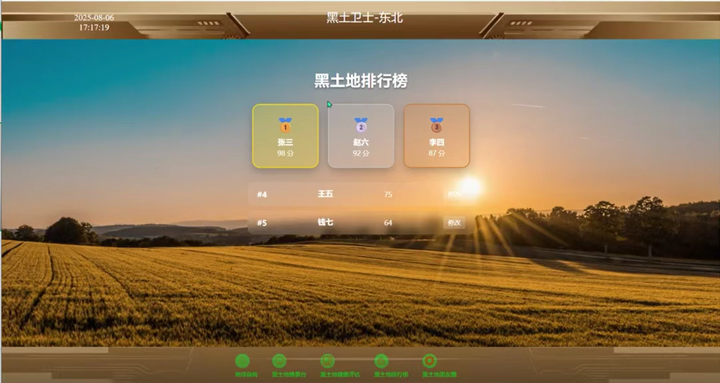 为激励农户积极性,项目设立黑土地保护排行榜,实时展示用户管理成效。榜单采用奖牌设计(金牌张三98分、银牌赵六92分、铜牌李四87分),底部显示第四名王五75分、第五名钱七64分,支持成绩修改功能。通过数据化竞争机制,推动黑土地保护从"要我做"转变为"我要做"。