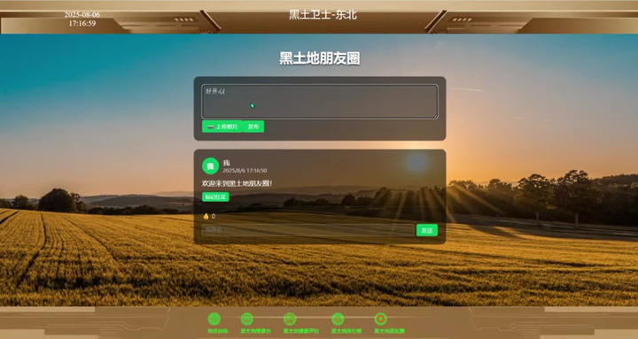 该项目创新打造"黑土地朋友圈",支持用户分享保护经验、上传农田照片。界面模拟社交媒体设计,包含文本输入框、照片上传按钮及动态信息流,用户可点赞评论优质内容。通过社交化传播,形成"保护黑土人人参与"的良好氛围,让科学保护知识走进田间地头。