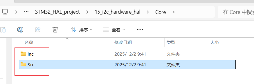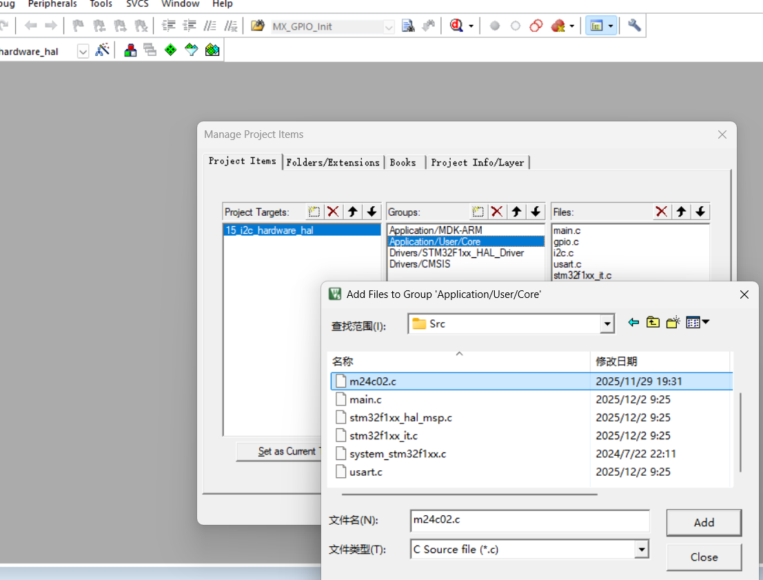 6.在新建的工程里面添加M24c.c 和.h 分别在src和inc文件夹里面