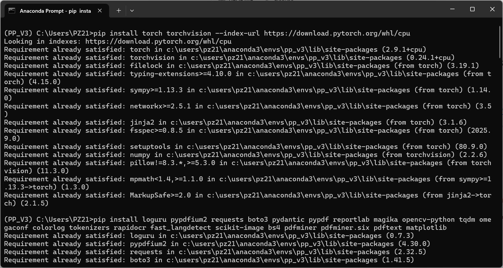 pip install loguru pypdfium2 requests boto3 pydantic pypdf reportlab magika opencv-python tqdm omegaconf colorlog tokenizers rapidocr fast_langdetect scikit-image bs4 pdfminer pdfminer.six pdftext matplotlib