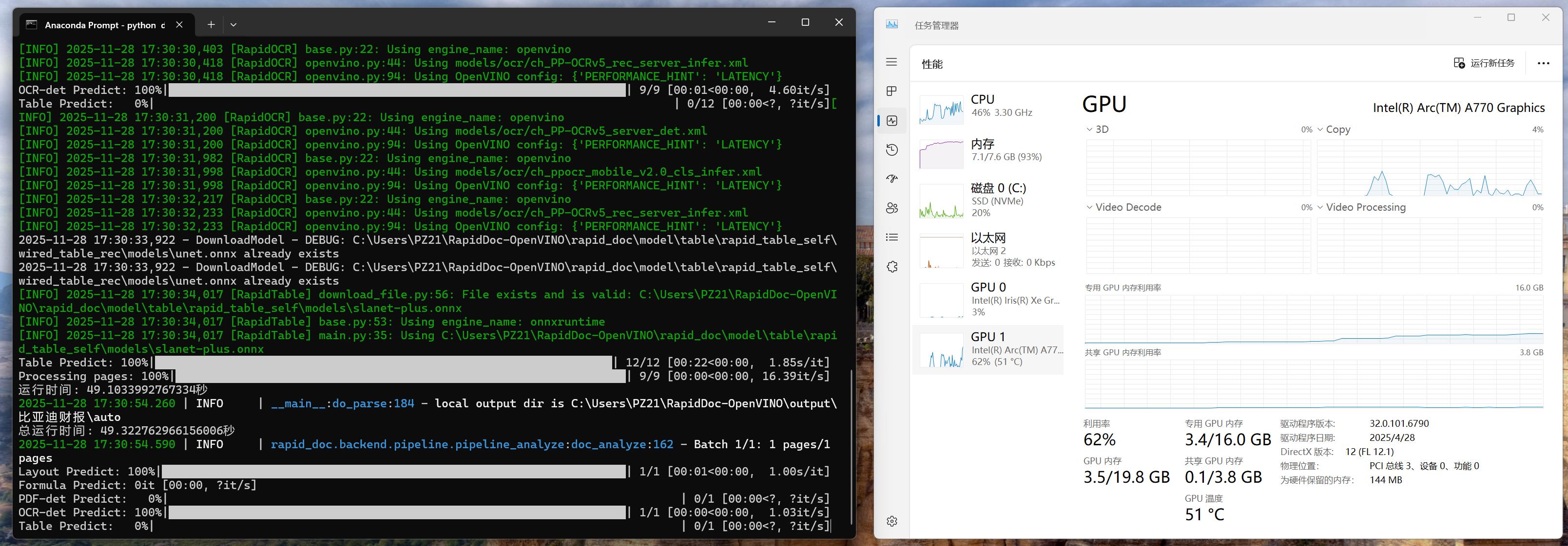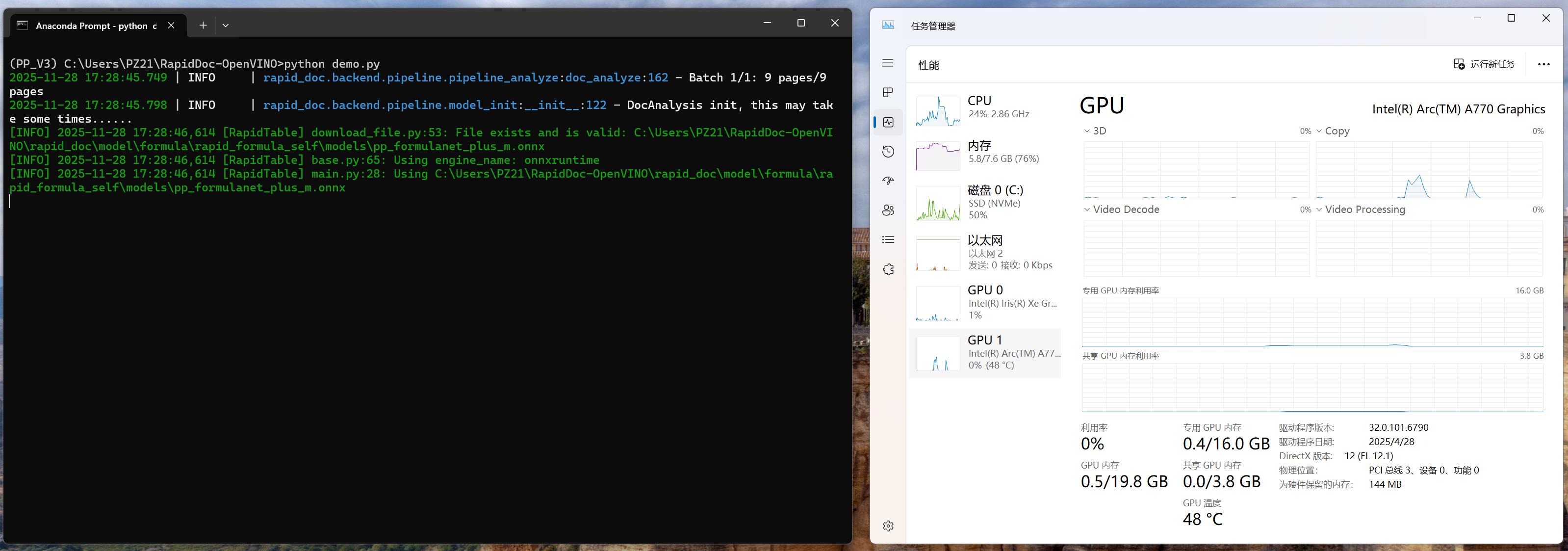 实际运行中,Intel GPU(Arc A770、Iris Xe Graphics)可正常调用,稳定完成多页面文档的 OCR、版面分析等任务,此次部署既验证了 RapidDoc 框架在轻量化工单解析场景的实用性,也证实了 OpenVINO™ 对 Inte GPU 的适配性,为后续工业、金融等领域的文档智能解析需求提供了可复用的技术方案。