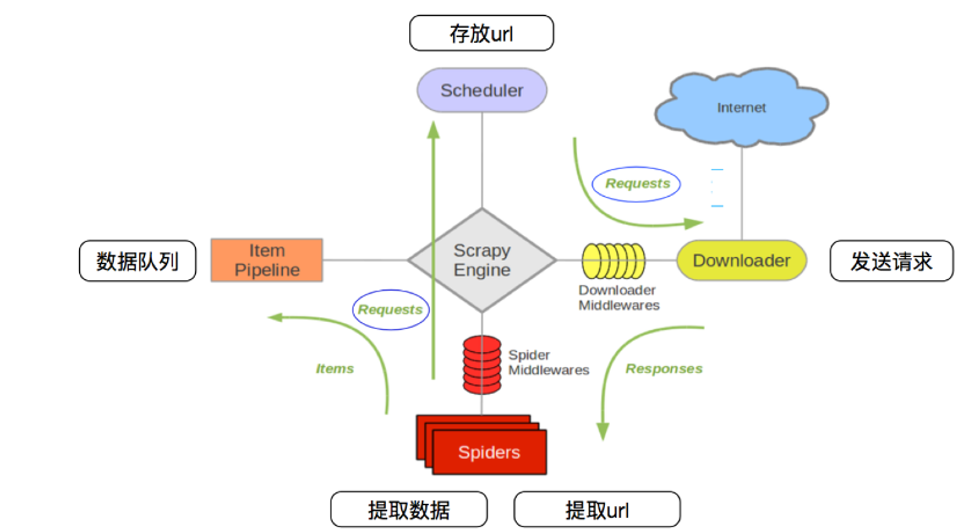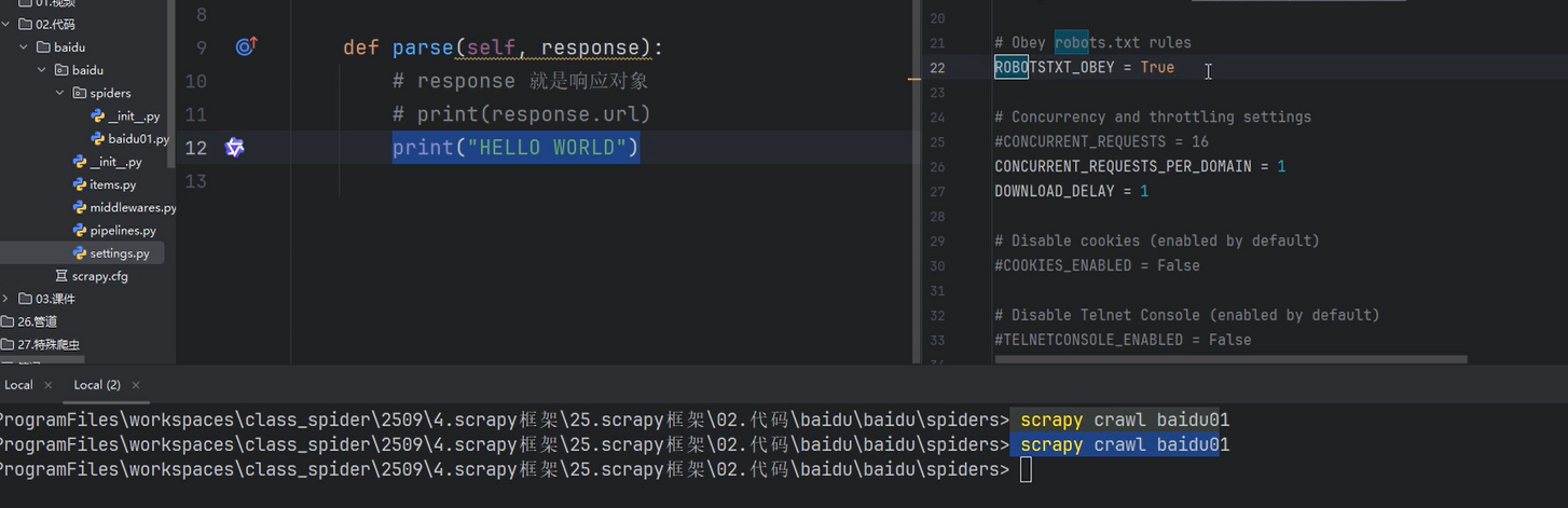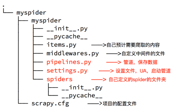 4.爬虫 (Spiders):爬虫是用户自定义的类,用于解析网页内容并提取数据。爬虫通常从一个或多个起始URL开始,然后跟踪网页中的链接以发现更多内容。(必须我们自己写的)