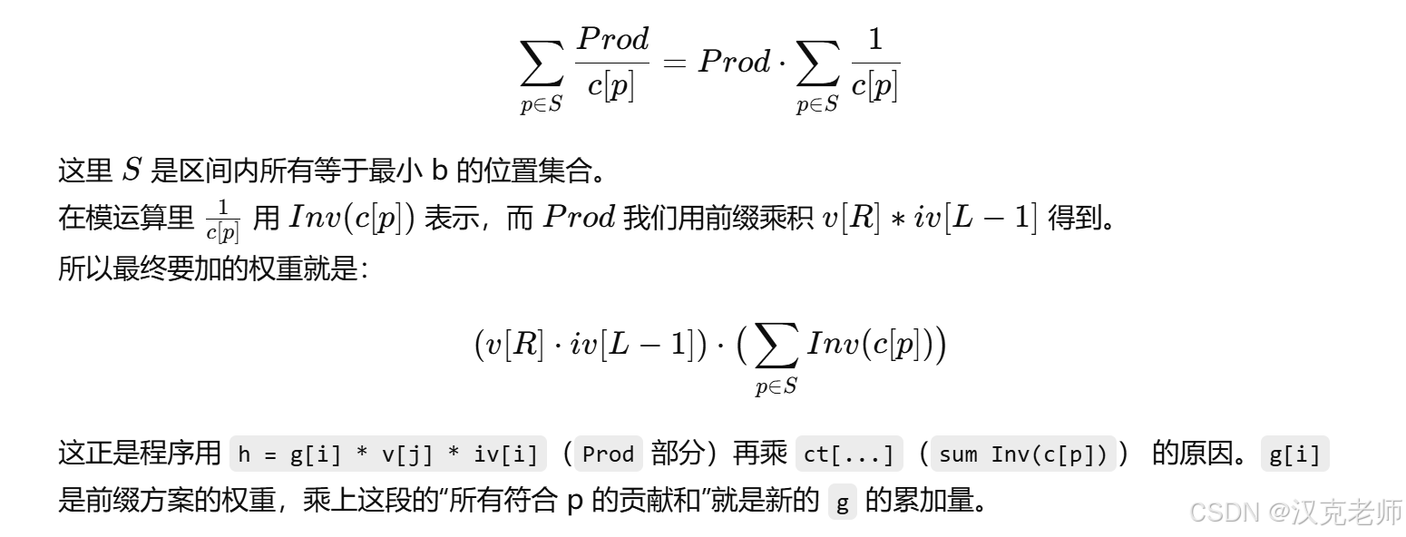 6、把 v[j]*iv[i]*ct 的工作做个简单代数说明(为什么它等于"对区间内所有最小 b 出现位置 p,求 sum(prod_except_c_p)")
