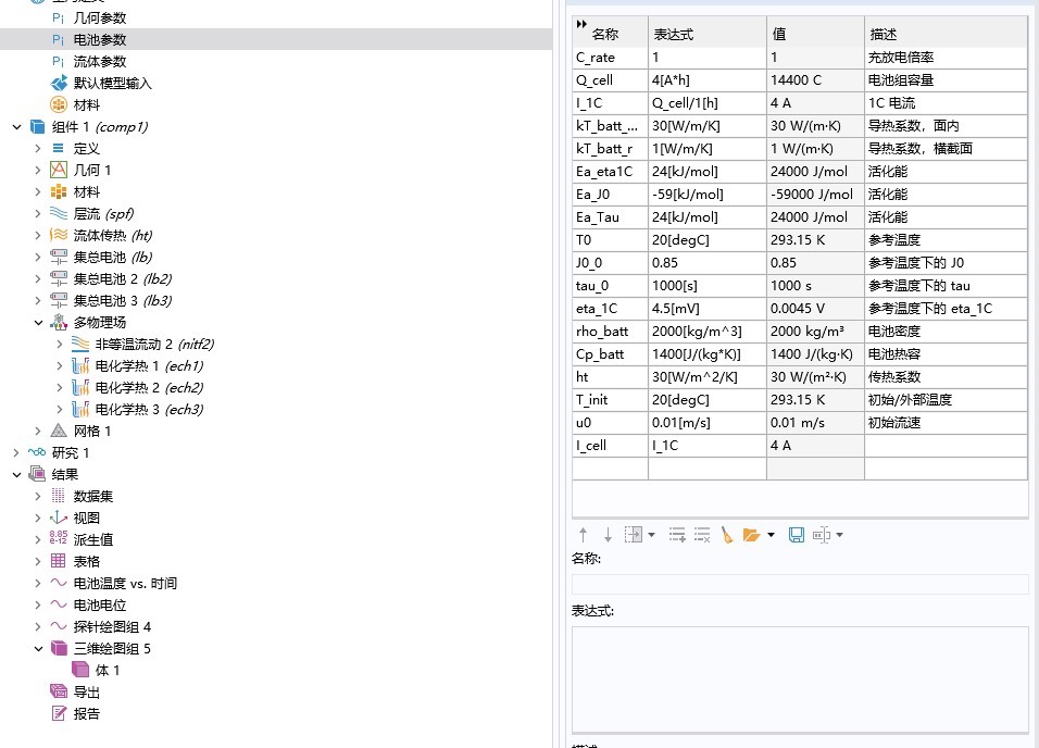 在 Comsol 模型里,类似这样通过参数设定和物理场耦合来精确模拟电池产热过程,只不过 Comsol 用的是其自身强大的多物理场耦合语言和模块,能处理比这复杂得多的实际情况。