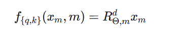 RoPE的核心思想是:通过一个旋转矩阵,在计算查询和键向量的点积注意力分数时,显式地注入绝对位置信息。对于位置为 m 的向量 x,其对应的查询(或键)向量通过如下旋转矩阵进行变换: