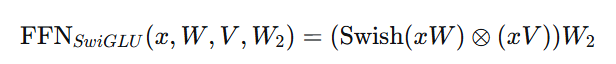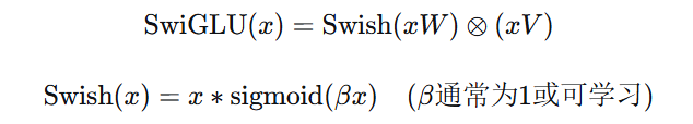 LLaMA在前馈网络中使用了 SwiGLU 激活函数,取代了原始的ReLU或GeLU。SwiGLU是GLU(Gated Linear Unit)变体的一种,其形式如下: