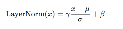 μ和σ是x的均值和标准差,γ和β是可学习的缩放和偏移参数。