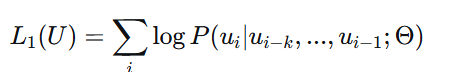 预训练阶段的目标函数是标准的自回归语言建模:给定一个词元序列 U={u1,...,un}U={u1,...,un},模型通过最大化如下似然函数来学习参数: