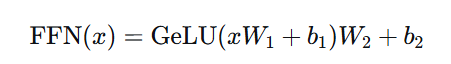 其中,W_1 ∈ R^(d_model × d_ff), W_2 ∈ R^(d_ff × d_model),d_ff 是中间层的维度,通常是 d_model 的4倍。GeLU(高斯误差线性单元)是比ReLU更平滑的激活函数,在大模型中表现更优。