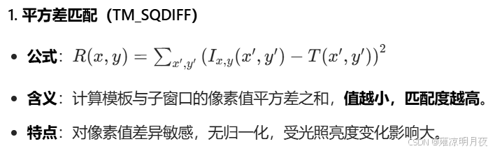常用的6种经典的模板匹配方法,核心区别在于相似度/差异度的计算方式。