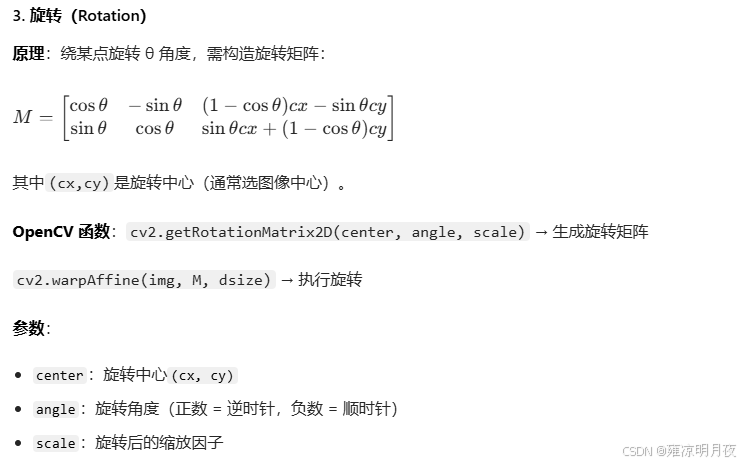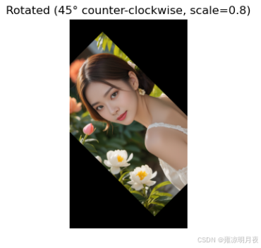 def Rotation(img): # 旋转中心:图像中心 center = (img.shape[1] // 2, img.shape[0] // 2) # 生成旋转矩阵:逆时针45度,缩放0.8倍 M = cv2.getRotationMatrix2D(center, 45, 0.8) # 执行旋转 img_rot = cv2.warpAffine(img, M, (img.shape[1], img.shape[0])) show_img(img,"Original") show_img(img_rot,"Rotated (45° counter-clockwise, scale=0.8)")