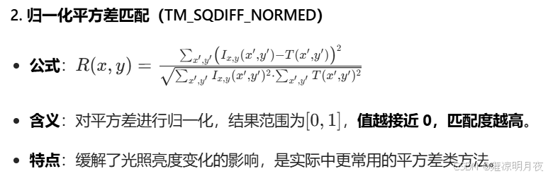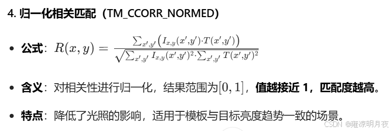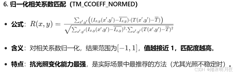 - 抗光照能力有限:仅归一化相关系数方法(TM_CCOEFF_NORMED)对光照有一定鲁棒性,其余方法受亮度影响大。
