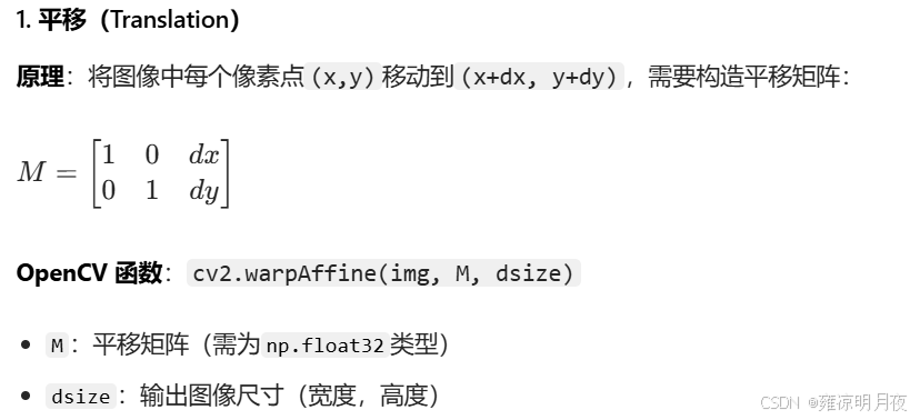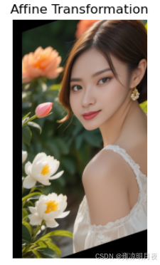 import cv2 import numpy as np import matplotlib.pyplot as plt path = r'../imgs/original_image.png' img = cv2.imread(path) if img is None: raise ValueError("图像路径错误") def show_img (img,title='img'): #用matplotlib显示图像(转换BGR→RGB) img_rgb = cv2.cvtColor(img, cv2.COLOR_BGR2RGB) plt.figure(figsize=[6,4]) plt.imshow(img_rgb) plt.title(title) plt.axis("off") plt.show() def Translate_img (img): #定义平移矩阵 dx = 50 #右50 dy = 30 #下30 #构造平移矩阵 M = np.float32([[1, 0, dx], [0, 1, dy]]) #执行平移操作 img_trans = cv2.warpAffine(img, M, (img.shape[1], img.shape[0])) show_img(img,'original_image') show_img(img_trans, title='Translate') if __name__ == '__main__': #平移操作 Translate_img(img)