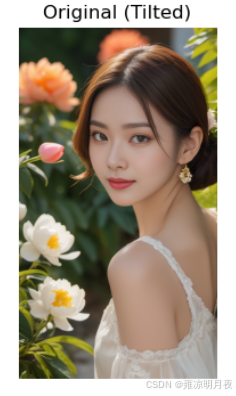 def Perspective_Transformation(img): # 原图中的4个点(比如文档的四个角) src = np.float32([[56, 65], [368, 52], [28, 387], [389, 390]]) # 变换后的目标点(矩形) dst = np.float32([[0, 0], [300, 0], [0, 300], [300, 300]]) # 生成透视矩阵 M = cv2.getPerspectiveTransform(src, dst) # 执行透视变换(输出尺寸设为(300,300)) img_persp = cv2.warpPerspective(img, M, (300, 300)) show_img(img,"Original (Tilted)") show_img(img_persp,"Perspective Correction")